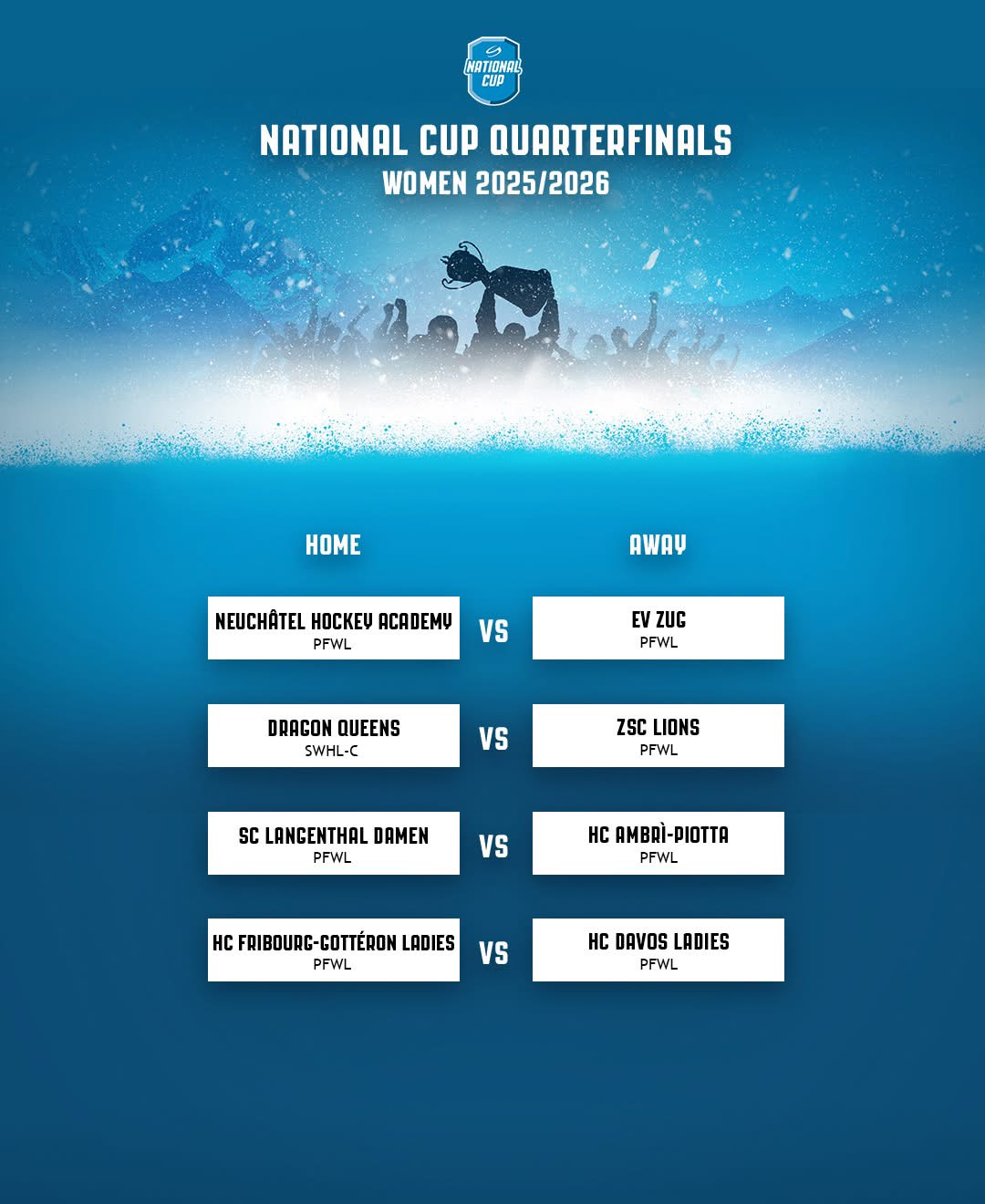 Die Siegerinnen der Viertelfinals qualifizieren sich für das Final-4-Turnier, das am 16. und 17. Januar 2026 in der Vaudoise Aréna in Lausanne stattfindet. Dort werden beide Halbfinals, das Final sowie das Spiel um Platz drei ausgetragen. Der Vorverkauf läuft bereits über sihf.ch/ticketing.